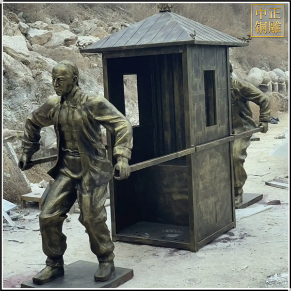 中正銅雕-抬轎子景觀人物雕塑、抬轎子景觀人物雕塑價格額、抬轎子景觀人物雕塑廠家,我公司集科研、開發設計、普通鑄造、一次性整體澆鑄、精密鑄造于一體。本公司技術力量雄厚,設備,不但重視中國青銅器原有的藝術風格,還繼承了文物原有的藝術品味,在繼承和發揚古老文化的同時,更深一步為新老客戶定身量制各種銅制、鐵制工藝品等產品,曾多次受到寺廟長老和美術學院教授的好評。