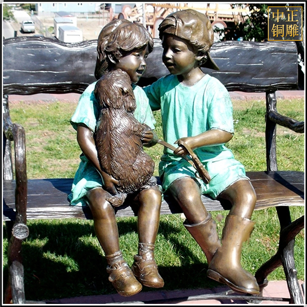 兩個小孩抱小狗人物銅雕塑